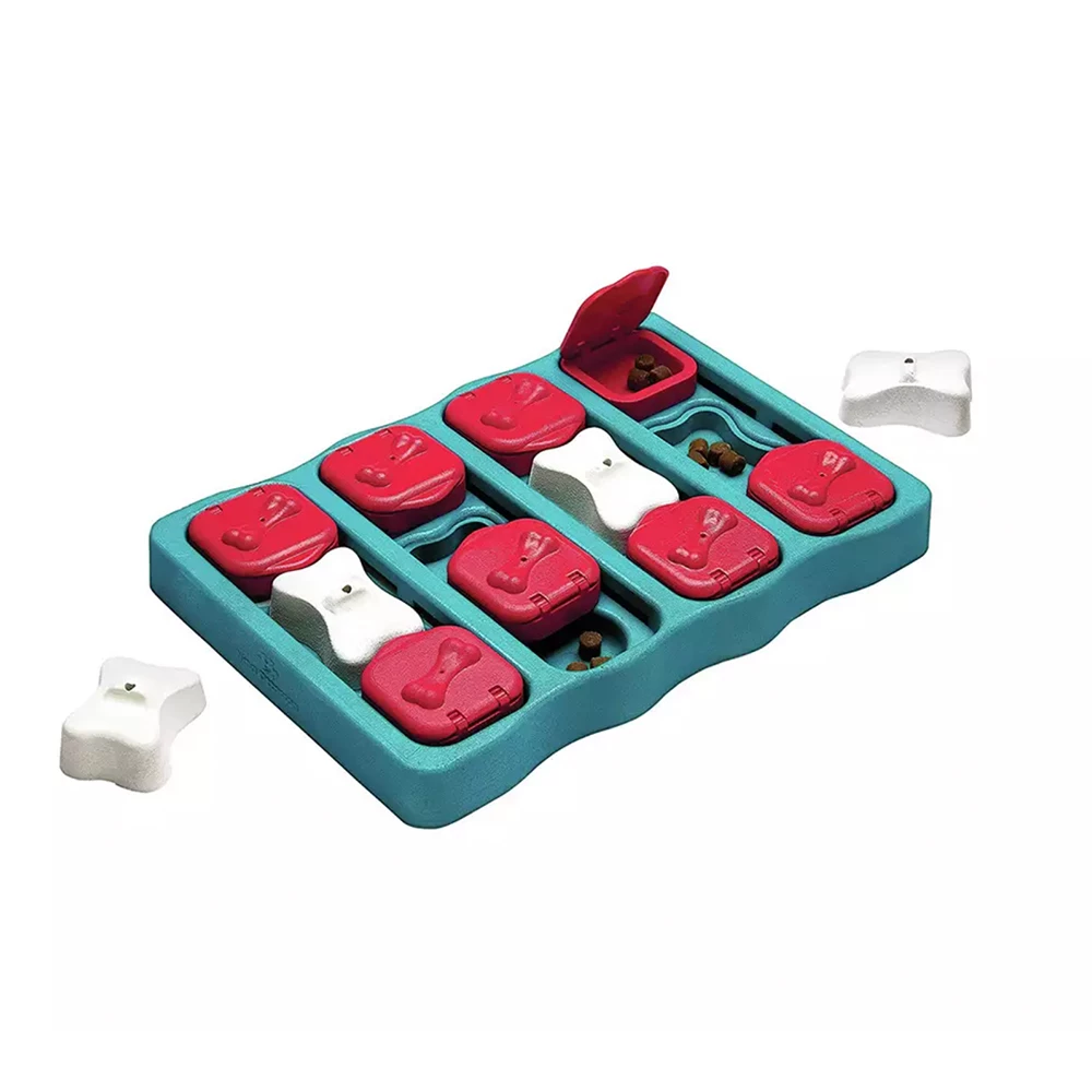 Complete with 3 different treat feeding features, the Nina Ottosson Dog Brick is made with easy open-close flip compartments to hide treats in, and comes with separate, removable bone puzzle pieces that offer an even more interesting challenge to seeking and eating treats! Your dog can easily slide and move each flip compartment to reveal even more hidden treats.