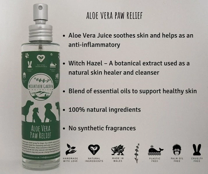 Mountain Garden Botanics understand how difficult it is to have a pet who has itchy or sore paws. They have experienced this with their own pets.Their aloe vera paw relief spray is perfect to cleanse paws gently after those muddy walks. Contains aloe vera juice which is packed with vitamins to soothe the skin and help as an anti-inflammatory. This spray also includes witch hazel which is a natural botanical extract used as a natural skin healer and cleanser. Handmade with a blend of essential oils to support healthy skin.